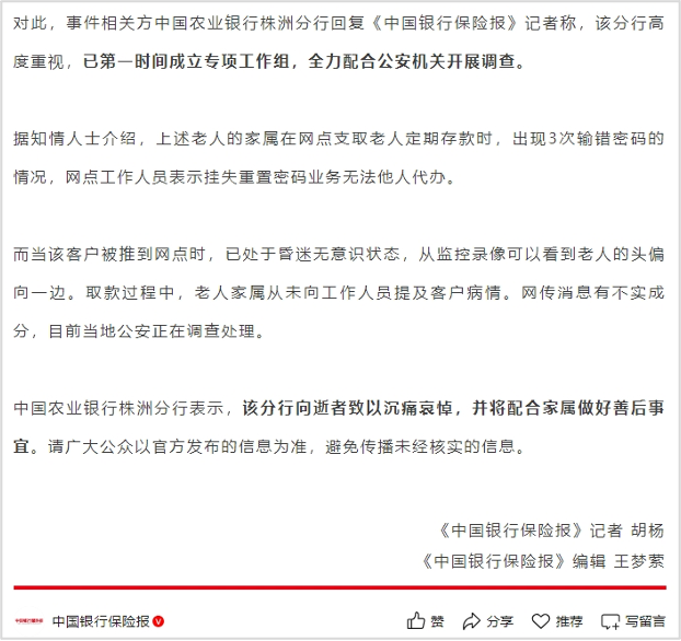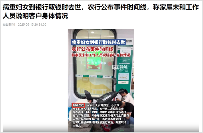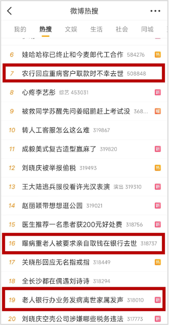 该视频发布后,引起舆论广泛关注,“曝病重老人被要求亲自取钱在银行去世”“农行回应重病客户取款时不幸去世”“老人银行办业务发病离世家属发声”等多个话题登上微博热搜榜。