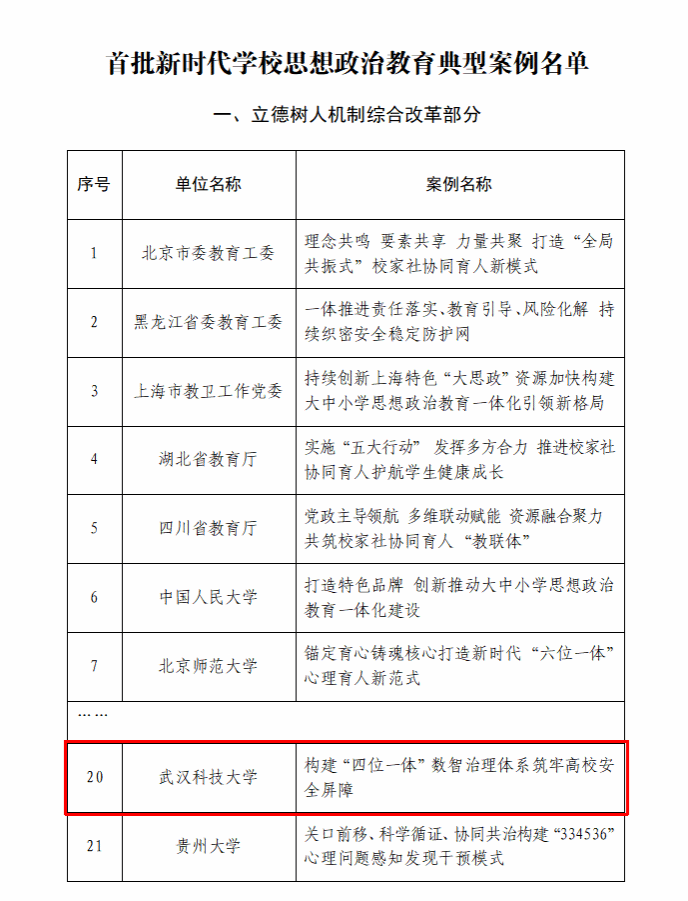 武科大网讯 3月25日,教育部公布首批新时代学校思想政治教育典型案例。首批100个典型案例对标新时代立德树人工程布局,包括立德树人机制综合改革、党的创新理论主课堂、新时代伟大变革实践育人大课堂、数字时代网络育人新课堂、教师队伍和基层组织建设等5大部分。我校湖北省高校网络舆情分析研究中心和湖北省人文社科重点研究基地“舆情研究中心”报送的案例《构建“四位一体”数智治理体系 筑牢高校安全屏障》成功入选。该案例也是湖北省属本科高校唯一入选案例。